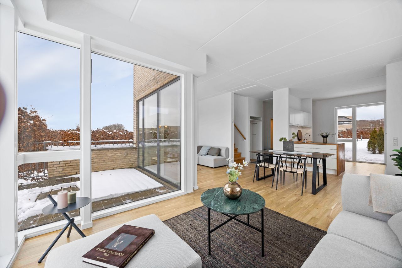 Velkommen til Bøgehaven 68 – et indflytningsklart, højtbeliggende enderækkehus i to plan, hvor rammerne for det nemme, trygge og aktive familieliv er helt ideelle. Boligen er beliggende i den attraktive bebyggelse Bøgehaven i Værløse – et kvarter kendt for sine rolige, lukkede veje, hvor børn trygt kan lege, cykle og finde legekammerater lige uden for døren. Her hersker en sjælden kombination af hverdagsro, fællesskab og nærvær. Et sted, hvor man hilser på hinanden, og hvor både børn, voksne og hunde hurtigt føler sig hjemme. Huset er tegnet af Juul og Frost i moderne funkisarkitektur og opført i 2008 med fokus på kvalitet, komfort og minimal vedligeholdelse. Som enderækkehus får du ekstra lys, luft og privatliv – og den høje placering i bebyggelsen sikrer både ugeneret udsigt og fremragende solforhold. De to skønne terrasser gør det muligt at følge solen hele dagen – fra morgenkaffen til aftensmaden under åben himmel. Indenfor fremstår boligen lys, moderne og fuldstændig indflytningsklar. Store vinduespartier og en gennemtænkt planløsning skaber en skøn sammenhæng mellem rummene og gør hjemmet velegnet til både børnefamilier og par, der ønsker god plads og komfort i hverdagen. Der er indkørsel til carport med tilhørende praktisk skur. Hovedindgangen ligger bekvemt ved husets bryggers med vaskesøjle og garderobeplads. Boligen rummer to badeværelser – det ene i stueplan fungerer også som gæstetoilet, mens badeværelset på førstesalen byder på både kar og bruseniche. Husets hjerte er det store og indbydende køkken-/alrum-/stue, hvor der er spiseplads ved køkkenøen, plads til det store spisebord og mulighed for enten to sofagrupper eller en fleksibel indretning med hjemmekontor eller legehjørne. Herfra er der direkte udgang til den solrige terrasse og haven. Ét af boligens fire værelser er placeret i stueplan – ideelt som gæsteværelse, kontor eller teenageafdeling. Et flot trappeløb fører til førstesalen, hvor man straks imponeres af det smukke lysindfald fra ovenlysvinduet. Førstesalen er helt uden skråvægge og optimalt udnyttet med tre gode værelser samt et indbydende badeværelse. Det ekstra store forældresoveværelse har skydedørsparti ud til en stor tagterrasse/balkon med plads til solsenge og en skøn udsigt over det rolige kvarter. Naturen ligger bogstaveligt talt lige udenfor døren. Med kort afstand til golfbanen, Farum Sø og Søndersø er der rig mulighed for gåture, løb, cykling og afslapning i grønne omgivelser året rundt. Samtidig er Værløse kendt for sit stærke fokus på sport og fritidsliv med blandt andet gode tennisfaciliteter og en populær, moderne svømmehal, som fungerer som et naturligt samlingspunkt for både børn og voksne. Bøgehaven 68 er kort sagt et hjem for dig, der drømmer om et trygt nærmiljø, aktive fritidsmuligheder og naturen som en naturlig del af hverdagen – alt sammen pakket ind i en moderne og indflytningsklar bolig.