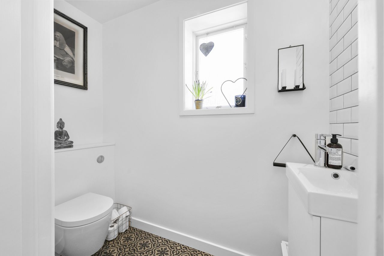 gæstetoilet og hele palletten af stuer: Forstue/bibliotek, tv-stue og spisestue. Opholdsrummene i
