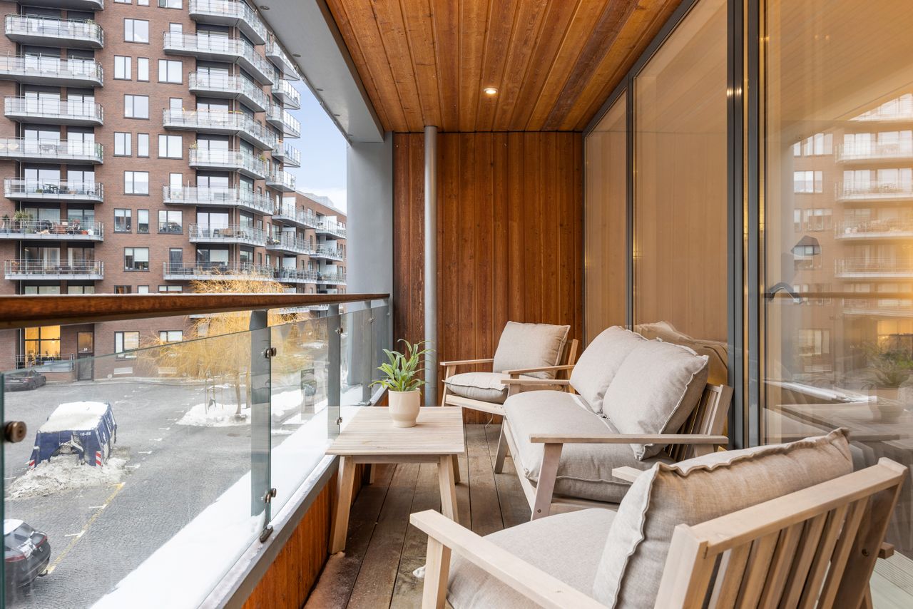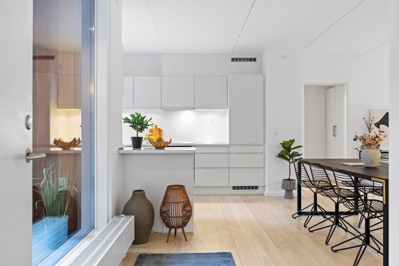 Allerede når man træder ind i lejligheden, mærker man det. Blikket trækkes automatisk mod lyset og videre ud. For her er det ikke stuen eller køkkenet, der først tager ordet, det er altanen/balkonen. Lejlighedens hjerte vender ud mod vest. En stor, indbydende altan/balkon, der fungerer som en naturlig forlængelse af boligen og binder inde og ude sammen på smukkeste vis. Inde i lejligheden samler det lyse køkken-alrum boligen, med udsigten som en konstant medspiller. Det er et rum, hvor hverdagen fungerer, og hvor man naturligt opholder sig, uanset om det er morgenkaffe, arbejde eller lange aftener med gæster. Lejligheden byder desuden på et indbydende badeværelse med vaskesøjle og god plads i hverdagen. De to regulære værelser er placeret i hver sin ende af boligen, hvilket giver en ideel opdeling. Planløsningen fungerer perfekt, hvad enten man er et par, har behov for hjemmearbejdsplads, eller ønsker en oplagt forældre- og børneafdeling, uden at gå på kompromis med sammenhængen i boligen. Amerika Plads er et levende og arkitektonisk smukt område med caféer, restauranter og byliv lige uden for døren. Samtidig er der kort afstand til både Nordhavns badezone og de grønne, rekreative omgivelser omkring Kastellet og Langelinie, oplagt til gåture, løb eller en rolig stund ved vandet. Hverdagen er nem med Østerport Station i nærheden, som giver hurtig adgang til både S-tog, regionaltog og metro, og på cykel når man Indre By på få minutter. En beliggenhed, hvor byens puls, vandet og de grønne åndehuller går op i en sjælden helhed. Der er naturligvis rigtig gode parkeringsmuligheder i den store parkeringskælder.