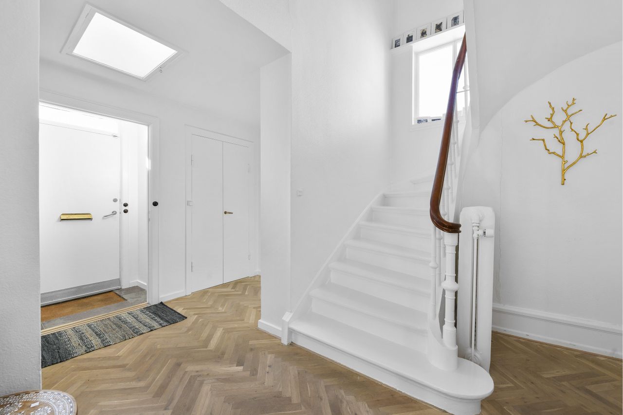 der bidrager med ekstra god stemning på adressen. Stueetagen byder på en smuk hall,