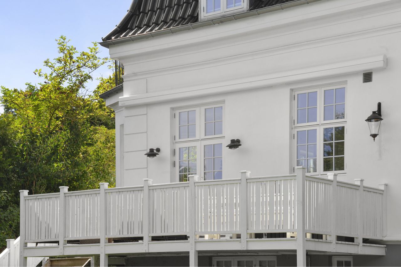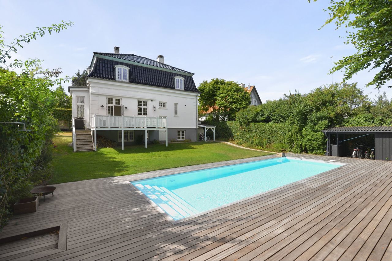 328 etagekvm. med hele 8 værelser og 2 kæmpe stuer en´suite i gennemført palævilla, der fremstår i en meget sjældent og super flot stand ude som inde. Bl.a. helt nyt og fantastisk pool miljø med Exclusiv Niveko saltvands swimming pool fra Berlepool 11M lang x 3,7M bred x 1,5M dyb og billig opvarmning via varmepumpe. Praktisk og smukt træterrasse omkring og flere indbyggede sofaer m.v. dette giver i den grad de nye heldige ejere masser af gode stunder og noget helt unikt der også giver haven en fantastisk helhed. 3 nye badeværelser i højeste kvalitet bl.a. med Vola og meget mere. Alle de efterspurgte detaljer og mere til dog bør de højloftet rum med ekstrem flot stuk udsmykning, sildebensparket, elegante franske fløjdørspartier og et fantastisk lysindfald fra de mange og nyere vinduespartier samt den flotte porcelænsovn fremhæves. Beliggenheden er som genbo og med udsigt til Bernstorffsparken. Allerede ved havelågen fornemmer man den skønne bolig, der venter de nye ejere, som både ønsker en harmonisk, præsentabel, samt meget hyggelig familievilla. Dobbelt hoveddør til skøn hall med stor garderobe, gæstetoilet også med bruseniche, flot trappeløb både til 1. sal og underetagen. 2 store stuer en 'suite, fordelt på klassisk spisestue til 14-16 personer, ekstra stor tv-/læse-/opholdsstue med plads til de helt store sofaer og eventuelt skrivebord foran den smukke og dekorative svenske porcelænsovn. Skønt og total istandsat "landkøkken" med dejlig spiseplads til 8 personer i delvis flot karnap, samt barstole ved køkkenøen. Endvidere fløjdøre direkte ud til dejlig stor træterrassen/haven, hvorfra der er nedgang og kig til det skønne pool miljø. 1 salen er ligeså imponerende og indbydende, indeholder bl.a. hele 4 værelser, hvor det ene er ekstra stort og med udgang til balkon. Nyt badeværelse med fine indretningsdetaljer, bl.a. stor bruseniche, dobbelt vask, badekar og naturligvis gulvvarme. Underetagen/kælderen er i fuldstændig boligkvalitet og boligen har i de sidste mange år været brugt som bolig med stemning af de engelske rækkehus. Her er også højt til loftet og dejligt lysindfald. 4 store værelser (bemærk ikke godkendt til bolig) ekstra depot-/vinrum og endnu et nyt og indbydende badeværelse med brus. Stort vaske-/fyr-/teknikrum. En palævilla der fremstår fuldstændig indflytningsklar.