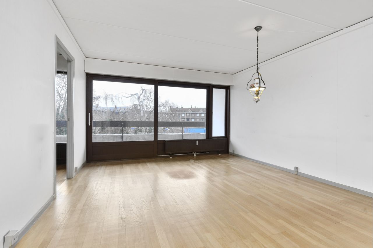 3 værelses lejlighed øverste oppe uden overboer, ekstra lys og ekstra god udsigt på begge sider af boligen. Stor sydvendt terrasse og elevator i ejendommen. En lejlighed der henvender sig til den voksne køber, i en yderst veldreven ejerforening med dørtlf, tørt kælderrum, cykelkælder samt fælles p pladser. Lejligheden indeholder: entre med skab, 2 stuer en´suite som er meget lyse og med vinduer og terrasse i hele længden. Ene stue kan også bruges som ekstra værelse eller kontor, tillige kan man nemt lave det om til en større vinkelstue. Godt badeværelse med kar /brus og vaskemaskine, kan eventuelt nemt laves om til kun stor bruseniche. Godt og stort soveværelse med skabsvæg og udsigt til villakvarter. Køkken har god skabsplads, lille spiseplads også udsigt over villakvarteret. En lejlighed der kræver lidt maling før indflytning. Desværre må der ikke holdes husdyr.