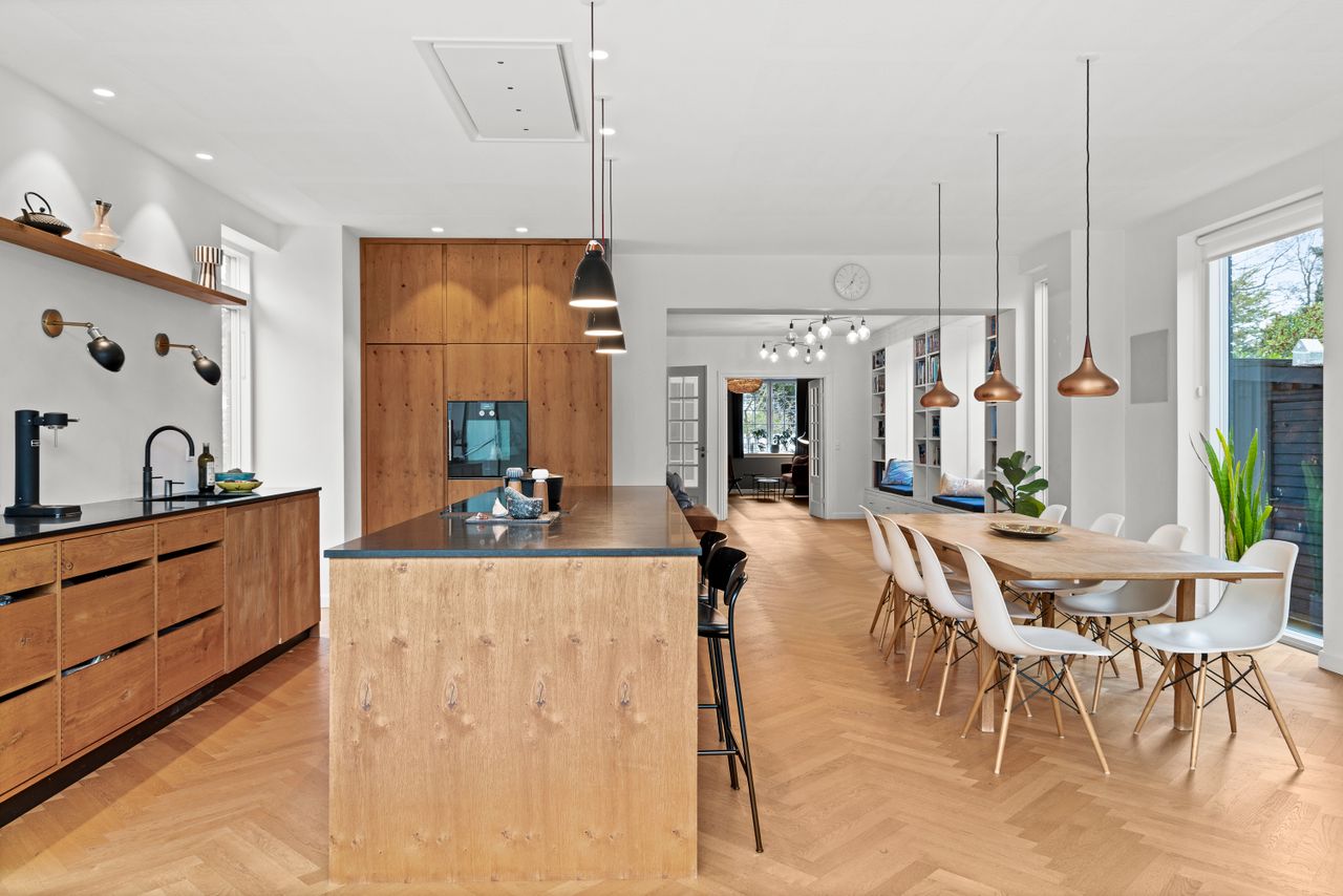 Renoveringen i 2019 omfattede gennemgående sildebensparket, gulvvarme på alle tre etager, nye toiletter og badeværelser med Vola-armaturer samt nye Bøjsø-vinduer. Huset er isoleret hele vejen rundt og har fået nyt tag, og energistandarden er tilsvarende høj. Samtidig er der opført en markant 50 m² tilbygning i et moderne design med køkken fra Handcrafted Interiors og imponerende gulv-til-loft-skydedøre, der åbner elegant mod den vestvendte terrasse og haven. Et sjældent hjem, hvor arkitektur, mod og funktionalitet er tænkt sammen – og hvor både inde- og udeliv opleves som en helstøbt helhed.