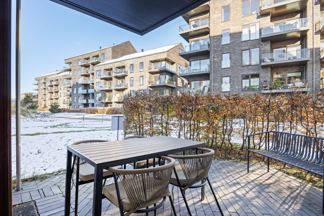 Lejligheden er 78 m², den føles større, fordi de store vinduespartier lukker masser af lys ind og giver rar atmosfære. Det er en af de boliger, hvor man straks mærker hyggen og roen, når man træder ind – lyset, planløsningen og stemningen arbejder virkelig godt sammen her. Lækkeret badeværelse naturligvis med stor bruseniche, vaskesøjle samt gulvvarme, ligesom i resten af boligen. Her er absolut ingen spildplads i lejligheden, det skønne køkken-/alrum-/stue er med god plads til både spiseafdeling og den behagelig store sofa. Rummet har hele 2 udgang til den solrige og private terrasse og her er både inde som ude et flot kig henover ejendommen grønne fællesareal.