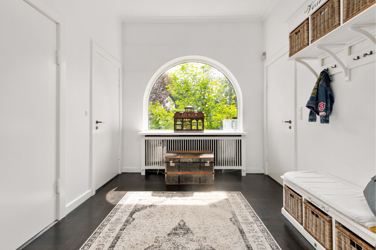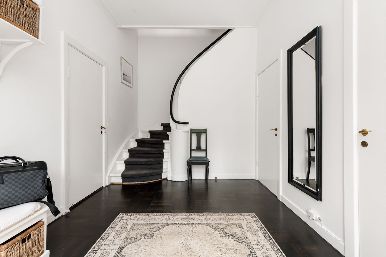 Entré der leder videre til et værelse/kontor samt en elegant forstue med et flot trappeløb